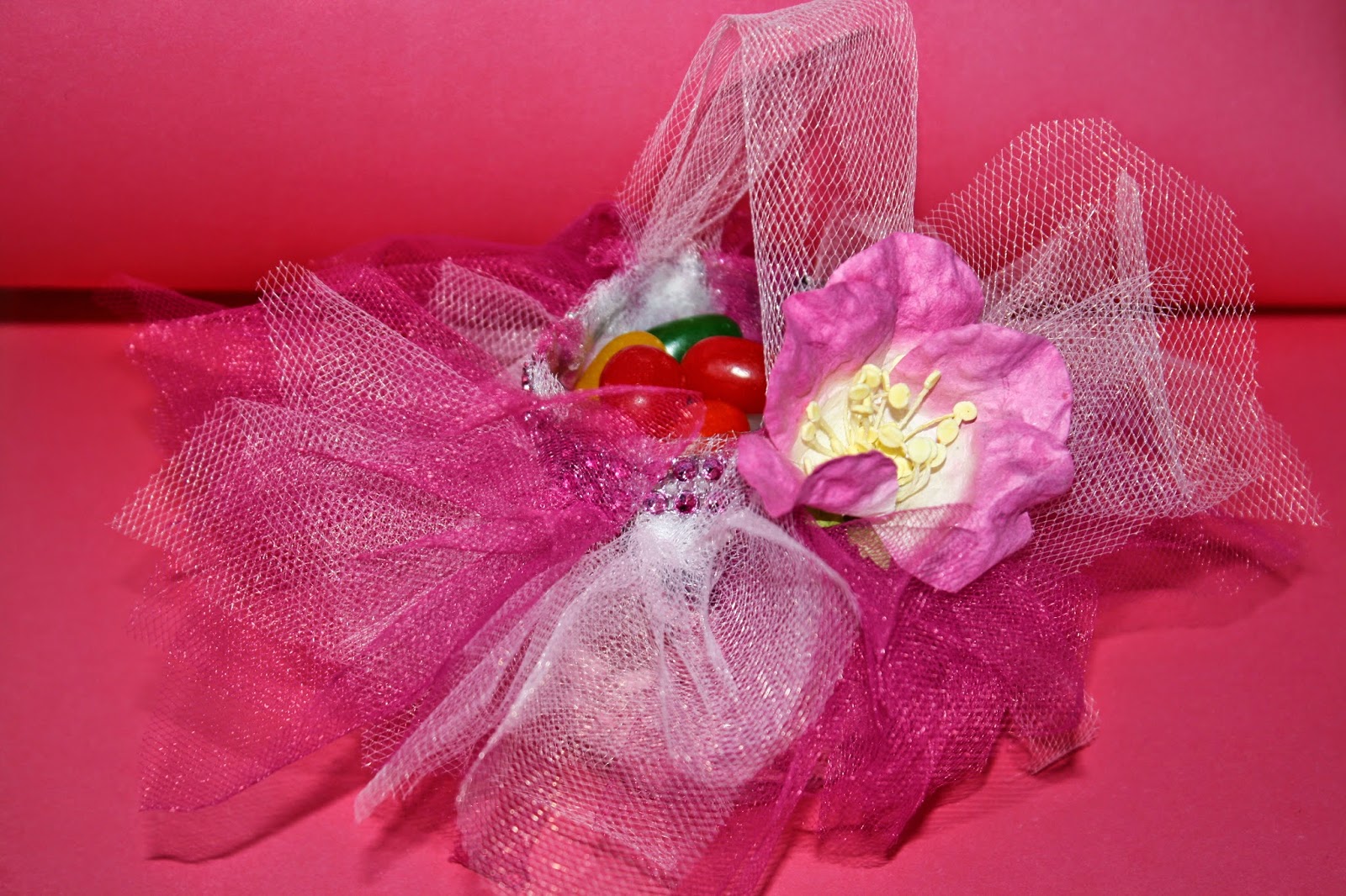 Make these super cute table party favors perfect for family get togethers, table decorating, keepsakes and so much more. Easy to do and lots of fun to make. With just a few items like, tulle, water bottles, hot glue. I used bling and also a flower embellishment. ( This is also a great way to recycle). You can save some money by making these yourself and none of your guests will ever even know that they just helped the world by recycling. They will, however, think that you went to a party store and spent a bundle! Now all that is left is to fill them up with your favorite candies. :):)